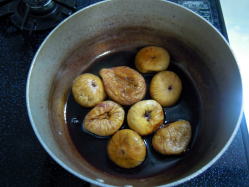 | 1, | 鍋に乾燥いちじくと赤ワイン(白ワイン)・砂糖・レモン汁を入れ、中火で火にかけ5分ぐらい煮る。 |