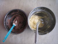 | 6, | 1つの生地にココアパウダーを入れ、ココア生地を作る。 |